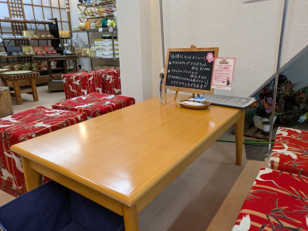 当店では、お着物選びや着付けをお待ちいただく間、またお出かけ前の待ち合わせにゆったりとお過ごしいただけるカフェスペースを店内に併設しております。